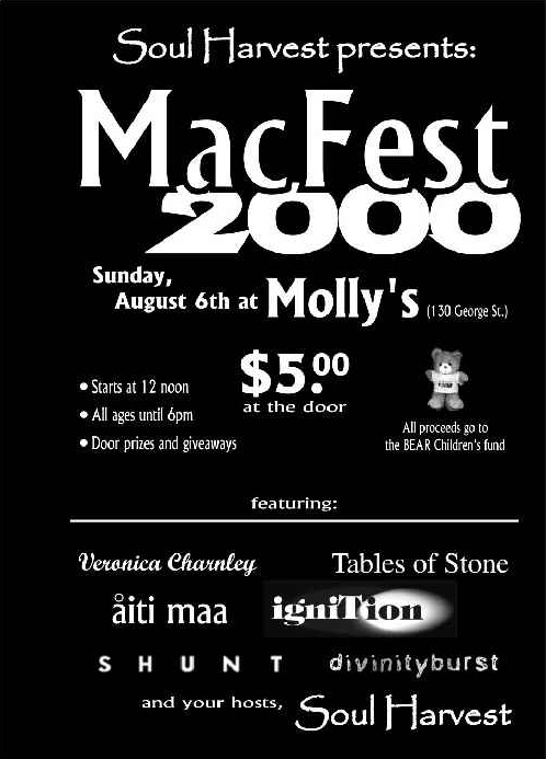 When: All-day/night Sunday, August 6th, 2000 Where: Molly's (formerly Molly McGuire's) in the Ottawa market Address: 130 George St., Ottawa, ON, Canada Why: All proceeds will be donated to the Bear Children's Fund How much: $5 at the door for the whole day
